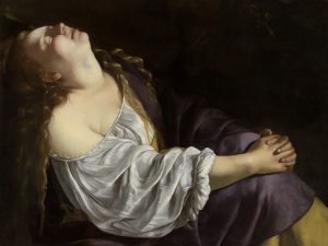 Educatasi a Roma sotto l’egida del padre Orazio, Artemisia Gentileschi maturò una consapevolezza estetica aderente a quei contrasti di luce e ombra tipici della poetica di Caravaggio, che si ritrova in questo dipinto segnato da un rapido traversone di luce, il cui soggetto sembra tradurre le fini discussioni che al tempo si tenevano nelle Accademie letterarie veneziane. Si andava infatti configurando un modo nuovo di intendere e rappresentare la donna, promosso non solo da poeti e letterati, ma anche dai pittori coinvolti in quei sodalizi accademici. Su questo terreno si innestò anche l’ambigua rappresentazione della Maddalena offerta nella Galeria di Giambattista Marino, principe dei poeti italiani del Seicento in contatto con diversi esponenti della cultura veneziana, pubblicata nel 1619. La “santa peccatrice” non veniva più intesa soltanto come la penitente che aveva abbandonato la vita mondana a seguito della felice conversione, ma si dava ampio spazio alla sua bellezza, il cui splendore, che si esprimeva mediante una valenza voluttuosa, rinviava anzitutto a una magnificenza spirituale. In linea con questo assunto, Maddalena non è qui raffigurata come penitente e quindi sofferente, bensì colta nell’attimo del rapimento estatico, che si esprime nel capo reclinato e nel sorriso appena accennato.