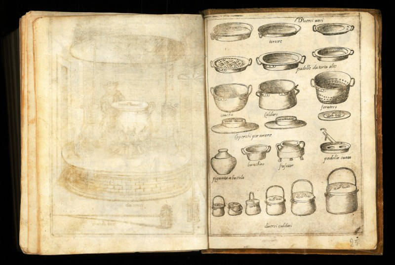 Bartolomeo Scappi (1500-1577), “Disegni di vasi, tortiere, padelle e caldari”, in B. Scappi, Opera di Bartolomeo Scappi mastro dell’arte del cucinare […], in Venetia, per Alessandro de’ Vecchi 1622, tavola calcografica, Venezia, Biblioteca del Museo Correr